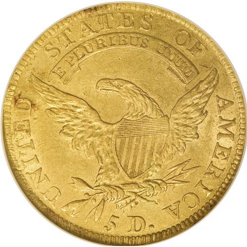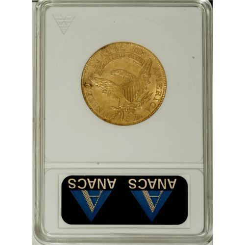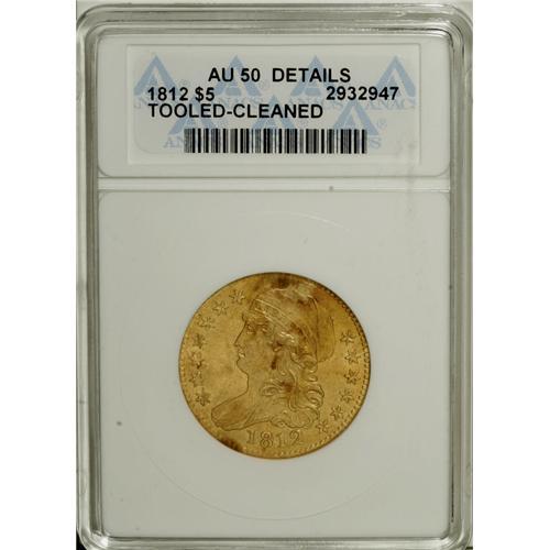 <B>1812 $5 --Tooled, Cleaned--ANACS. AU50 Details.</B></I> Narrow 5D, Breen-6465, BD-2, R.4. Both sides of this piece have brilliant yellow-gold with splashes of deeper orange color. A few light hairlines are visible in the left obverse field, with additional evidence of cleaning. The surfaces are lightly abraded, but there is no evidence that any details were reengraved or otherwise strengthened.<BR><BR><b>Shipping:</b> Coins & Currency (<a target="_blank" href="http://www.heritageauctions.com/common/shipping.php">view shipping information</a>)