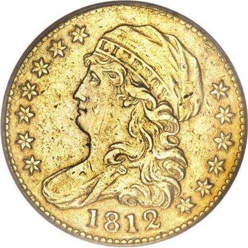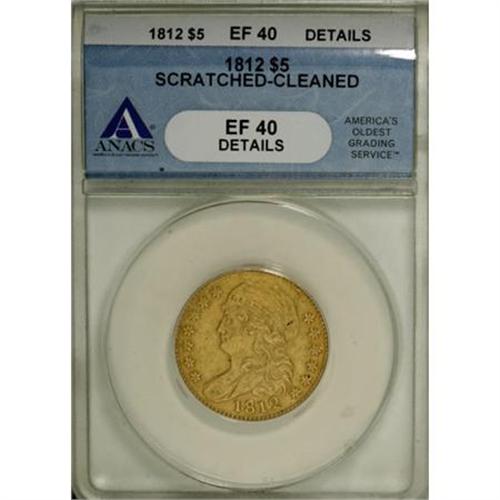 <B>1812 $5 --Scratched, Cleaned--ANACS. XF40 Details.</B></I> Narrow 5D, Breen-6465, BD-2, High R.4. This olive-gold early half eagle has a cloudy appearance from fine hairlines, and there are a pair of faded vertical marks on the portrait. Still a rare variety, seen much less often than the Wide 5D BD-1. Richly detailed for the assigned XF grade.<BR><I>Ex: Stack's, 3/91, lot 1010.</B></I><BR><I>From The John Stimson, Sr. Collection, Part Two.</B></I><BR><BR><B>Coin Engraver:</B> John Reich<BR><BR><b>Shipping:</b> Coins & Currency (<a target="_blank" href="http://www.heritageauctions.com/common/shipping.php">view shipping information</a>)