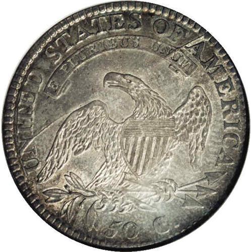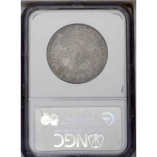 <B>1812<50C> AU53 NGC.</B></I> O-106, R.3. This spectacularly flashy coin is a fitting ending to this multiple offering of the dramatically broken-die O-106 varieties. This coin offers original, lovely lavender-gray toning, accented by hints of bronze and copper. The strike is decent as well, with some star centrils visible, yet the robust strike must have accelerated the die's disintegration. The huge die break that bisects the coin's obverse has given it two different planes or levels, with more light wear noted on the left (facing) half. The obverse die, not surprisingly, also shows advanced die erosion. The reverse die shows little die erosion, with robust detail evident on the eagle. Another large die break runs from N in UNITED, through the eagle and to the first A in AMERICA. Consider this a prime opportunity to add this lovely and possibly underrated coin to your variety collection of Capped Bust half dollars.<BR><I>Ex: Nick Vinci (6/22/1983).</B></I> Envelope Included.
