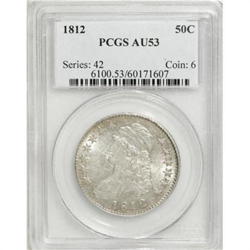 <B>1812 50C AU53 PCGS.</B></I> PCGS Population (33/302). NGC Census: (38/412). Mintage: 1,628,059. Numismedia Wsl. Price for NGC/PCGS coin in AU53: $500. (#6100)<BR><BR><B>Coin Engraver:</B> John Reich<BR><BR><b>Shipping:</b> Coins & Currency (<a target="_blank" href="http://www.heritageauctions.com/common/shipping.php">view shipping information</a>)