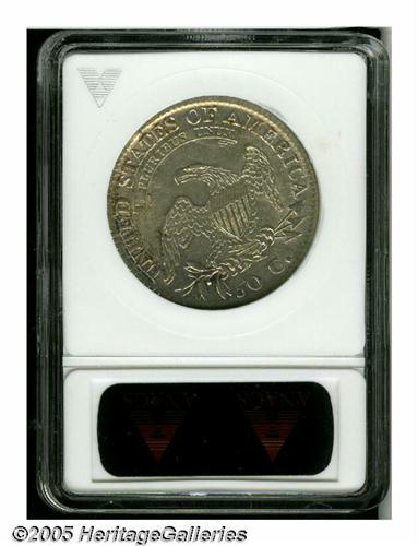 <B>1812<50C> AU55 ANACS.</B></I> O-103, R.1. Most easily attributed by two small die dots below the I in AMERICA and one dot below the U in UNITED. Silvery surfaces retain nice luster in the recessed areas. Nicely defined, except for traces of softness in Liberty's hair curls, and the usual flatness in the stars along the right (facing) border. There are no serious contact marks to report.