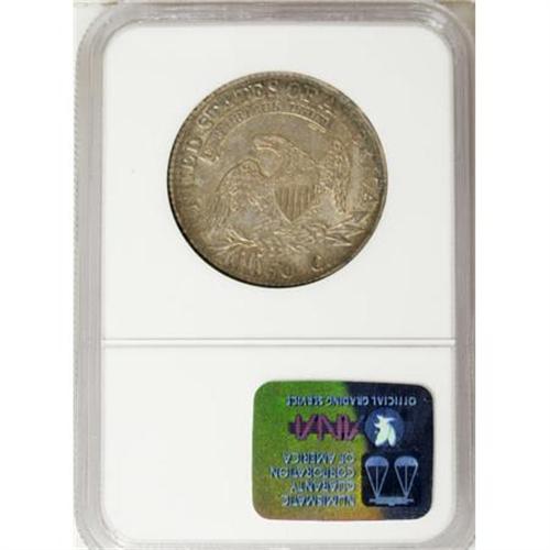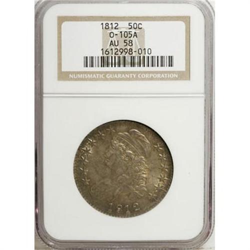 <B>1812 50C AU58 NGC.</B></I> O-105a, R.2. A prominent die crack runs through the first two digits of the date and links all stars. This well struck example, still-lustrous with minor highpoint friction, has attractive blue-green toning at the margins that cedes to peach at the centers.<BR><BR><B>Coin Engraver:</B> John Reich<BR><BR><b>Shipping:</b> Coins & Currency (<a target="_blank" href="http://www.heritageauctions.com/common/shipping.php">view shipping information</a>\)