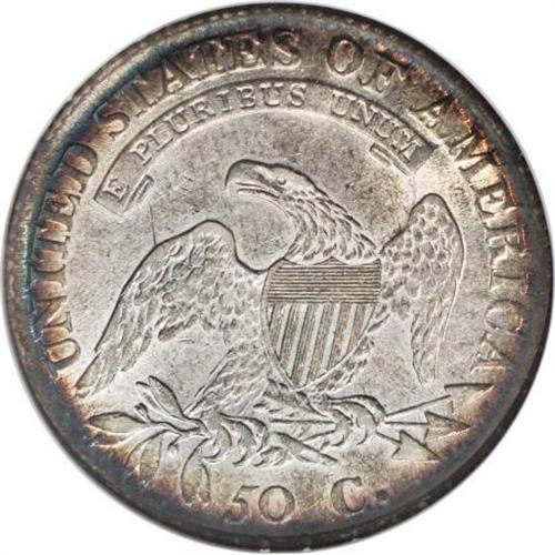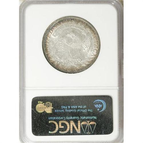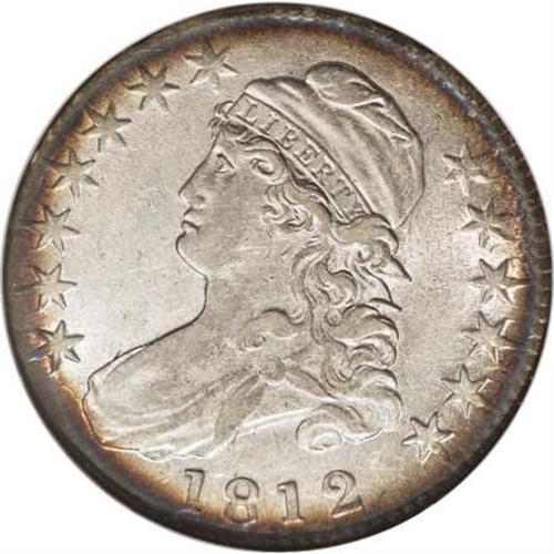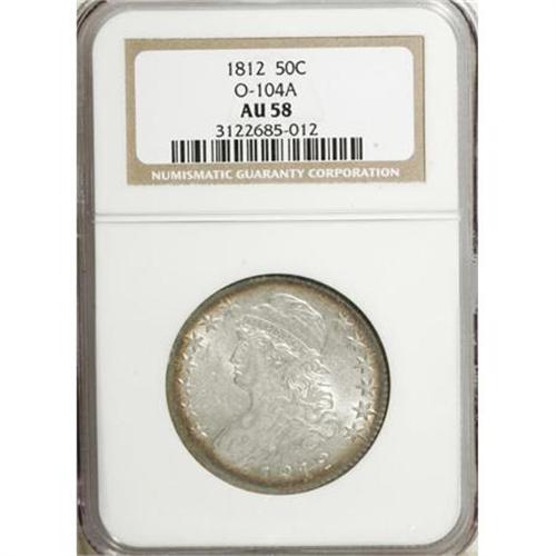 <B>1812 50C AU58 NGC.</B></I> "O-104b, R.7." The Overton reference describes 1812 O-104 in an early die state, and O-104a in a later die state, but does not mention the terminal die state that is now called "O-104b." Stephen Herrman lists just such a die state and suggests that it might be Rarity-7. Obviously, we mention this as the present coin is in just such a die state.<BR> The requirements of O-104a include "fine die cracks at NITED and top of STATES. Another fine crack from olive leaves across eagle and scroll to OF." These reverse cracks are all present on the present coin, a lustrous near mint example with brilliant silver surfaces and delightful peripheral iridescence.<BR> The additional requirement of O-104b, as Herrman describes, is an obverse die crack from the top of the 1 across the bust to star 1. The obverse die crack on the present coin is immediately obvious to the naked eye. The present coin will be the first example of the late die state to sell at auction, according to Herrman's record.<BR><BR><B>Coin Engraver:</B> John Reich<BR><BR><b>Shipping:</b> Coins & Currency (<a target="_blank" href="http://www.heritageauctions.com/common/shipping.php">view shipping information</a>)