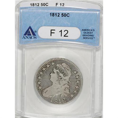 <B>1812 50C F12 ANACS.</B></I> NGC Census: (10/580). PCGS Population (10/536). Mintage: 1,628,059. Numismedia Wsl. Price for NGC/PCGS coin in F12: $80. (#6100)<BR><BR><B>Coin Engraver:</B> John Reich<BR><BR><b>Shipping:</b> Coins & Currency (<a target="_blank" href="http://www.heritageauctions.com/common/shipping.php">view shipping information</a>)