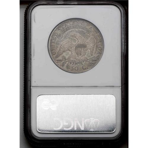 <B>1812<50C> Fine 15 NGC.</B></I> O-105a, R.1. A heavy die crack runs through 18 in the date, extending upwards through the left side obverse stars. A pleasing mix of lighter colors adorns each side, with coral, olive, and gold being the most prominent. Moderately worn, with a few wispy pinscratches and contact marks on obverse and reverse alike. The rims are unevenly defined. Envelope Included.