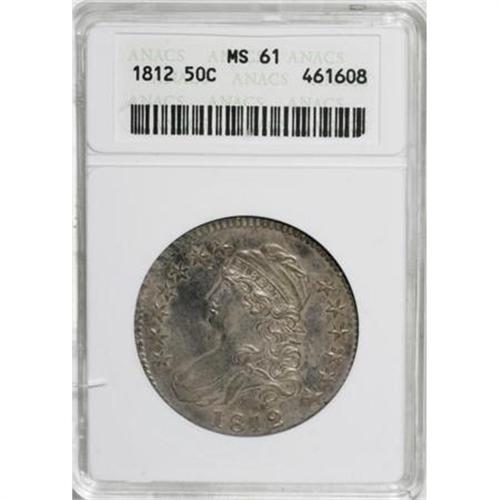 <B>1812 50C MS61 ANACS.</B></I> O-105, R.1. Straw-gold, ice-blue, and cream-gray embrace this satiny and smooth example. Sharply struck except for the ST in STATES. The obverse is uncentered, with complete denticles near 11 o'clock and no denticles near 5 o'clock. The reverse is also slightly uncentered, toward 4 o'clock.<BR><BR><B>Coin Engraver:</B> John Reich<BR><BR><b>Shipping:</b> Coins & Currency (<a target="_blank" href="http://www.heritageauctions.com/common/shipping.php">view shipping information</a>)
