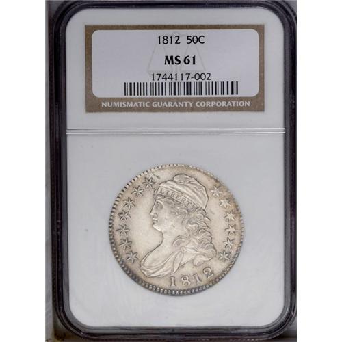 <B>1812 50C MS61 NGC.</B></I> O-107, R.1. All digits of the date lean left, and the 1 is high, and the 81 is closer than 18 or 12. Semi-bright surfaces display hints of light tan color and soft luster. A bold strike enlivens the design elements, except that the stars along the upper right (facing) border are soft in the center. A handful of minute abrasions are visible on Liberty's cheek and neck.