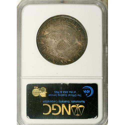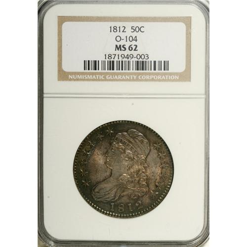 <B>1812 50C MS62 NGC.</B></I> O-104, R.1. Rich blue-green borders and lighter tan-gray centers confirm the originality of this satiny and attractive Bust half. A hair-thin vertical mark above the cleavage is all that limits the grade.<BR><I>From The Rocky Top Collection of Bust Half Dollars.</B></I><BR><BR><b>Shipping:</b> Coins & Currency (<a target="_blank" href="http://www.heritageauctions.com/common/shipping.php">view shipping information</a>)
