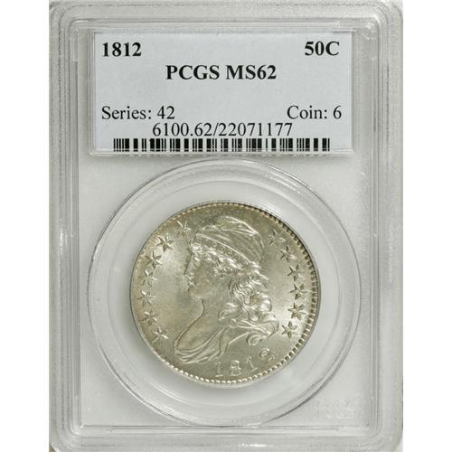 <B>1812 50C MS62 PCGS.</B></I> O-104, R.1. Best identified by a pair of lines through the eagle's left (facing) wing. This coin is bright and lustrous, with no signs of toning aside from a hint of light gold on the lower reverse rim. Typically defined with surfaces that display few marks for the grade.<BR><I>From The Greg Southward Collection.</B></I><BR><BR><b>Shipping:</b> Coins & Currency (<a target="_blank" href="http://www.heritageauctions.com/common/shipping.php">view shipping information</a>)