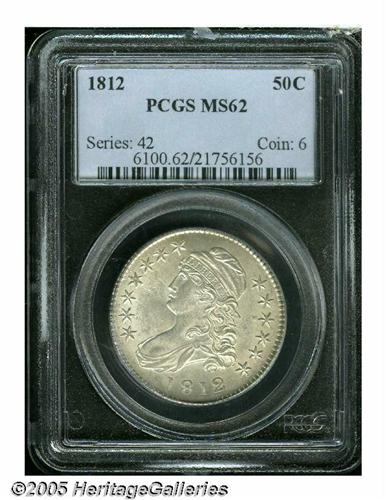 <B>1812<50C> MS62 PCGS.</B></I> O-109, R.2. This variety is attributed by the low round lump to the left of star 10, and the A and M of AMERICA nearly touching. We do not call this coin O-109a (despite the "die defects" at the lower right wing) because it has complete milling on both sides. Nicely struck, with only localized softness on the eagle's right wing. Bright silver-gray surfaces are devoid of significant contact marks. Bold die clashing occurs on each side.