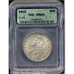 <B>1812<50C> MS63 ICG.</B></I> O-109a, R.2. This frosty half dollar has light gold toning over bright silver surfaces. Rather typical strike with some weakness along the upper edge of the eagle's right wing to the viewer's left. <BR><BR><B>Important notice:</B> Heritage usually auctions material at the rate of 200-250 lots per hour. On some occasions eBay Live bid software or the Internet may not be able to keep up with the pace of the auction. We recommend placing a realistic absentee bid now as insurance to avoid disappointment. Occasionally the auctioneer may eliminate or reject an eBay Live bid, and the auctioneer may also reopen a lot after the close of the eBay live bidding (usually because we missed an audience bid), and may reject your bid even if it shows you as the winning bidder. By bidding via eBay Live, you agree that Heritage may award the lot to another bidder at its sole discretion under the circumstances described above or any other reasonable circumstances. Since eBay bids are not shown to us until we open the lot on the floor, we treat those bids just like floor bids. In most cases the floor responds before the eBay bid is presented to us, due to Internet lag time, so for consistency we have made it a policy that floor bids are always considered first over tie eBay live bids. Also please note that all Heritage lots purchased through eBay Live carry a 20% Buyer's Premium. Please make sure you read the Terms and Conditions before you bid. </span></font></tr></table></td></tr></table>