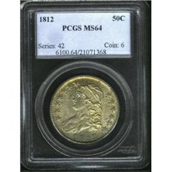 <TABLE cellSpacing=0 cellPadding=0 width="100%" bgColor=#000000 border=0><TBODY><TR><TD width="100%"><TABLE cellSpacing=1 cellPadding=3 width="100%" border=0><TBODY><TR><TD width="100%" bgColor=#79735c><FONT face=arial color=#ffffff size=3><B>Description</B> </FONT></TD></TR><TR><TD width="100%" bgColor=#ffffff><FONT face=arial size=2><B>1812 50C MS64 PCGS.</B></I> O-103, R.1. Most easily attributed by two small die dots below the I in AMERICA and one dot below the U in UNITED. As with a great many of the Bust halves in this sale, this is another Condition Census example. The C.C. listed in Overton's third edition is (67, 65, 65, 65, 64). Soft, frosted mint luster covers each side with a light overlay of golden patina. Well struck except, of course, on the stars on the right side of the obverse, a diagnostic of the variety. Lightly abraded, the most easily spotted pedigree identifier is a light grease stain (as struck) by star 11.<BR><I>Ex: Kingswood Galleries (Bowers and Merena, 6/02), lot 379, where it realized $4,603.45.</B></I> </FONT></TD></TR></TBODY></TABLE></TD></TR></TBODY></TABLE><BR><A name=PricesRealized></A><TABLE cellSpacing=0 cellPadding=0 width="100%" bgColor=#000000 border=0><TBODY><TR><TD width="100%"><TABLE cellSpacing=1 cellPadding=3 width="100%" border=0><TBODY><TR><TD width="100%" bgColor=#79735c><A name=PR><FONT face=arial color=#ffffff size=3><B>Previous Prices from Heritage Auctions</B> </FONT></A></TD></TR><TR><TD bgColor=#f6f6ed><TABLE cellSpacing=0 cellPadding=0 width="100%" border=1><TBODY><TR><TD align=middle width="33%"><B>Date</B></TD><TD align=middle width="33%"><B>Service</B></TD><TD align=middle width="33%"><B>Price</B></TD></TR><TR bgColor=whitesmoke><TD width="33%"><B>08/07/1998</B></TD><TD width="33%">PCGS</TD><TD width="33%">$3,277.50</TD></TR><TR bgColor=whitesmoke><TD width="33%"><B>01/01/1999</B></TD><TD width="33%">PCGS</TD><TD width="33%">$7,590.00</TD></TR><TR bgColor=whitesmoke><TD width="33%"><B>01/08/1999</B></TD><TD width="33%">NGC</TD><TD width="33%">$2,616.25</TD></TR><TR bgColor=whitesmoke><TD width="33%"><B>06/01/2000</B></TD><TD width="33%">NGC</TD><TD width="33%">$6,613.00</TD></TR><TR bgColor=whitesmoke><TD width="33%"><B>05/03/2003</B></TD><TD width="33%">NGC</TD><TD width="33%">$2,990.00</TD></TR></TBODY></TABLE></TD></TR><TR><TD bgColor=#ffffff><FONT face=arial size=1 ?>PLEASE NOTE: All prices realized reflect the final hammer price PLUS the buyer's premium in auctions that charge a buyer's premium. Each item has a notation at the top of the listing indicating whether that lot included a buyer's premium. Example: A item that sells with a final hammer price of $100 and a 20% buyer's premium will display with a price realized of $120. All information listed is intended to be as accurate as possible, but errors are possible. Please use this guide carefully and inform us of any inaccuracies. </FONT></TD></TR></TBODY></TABLE></TD></TR></TBODY></TABLE><BR><TABLE cellSpacing=0 cellPadding=0 width="100%" bgColor=#000000 border=0><TBODY><TR><TD width="100%"><TABLE cellSpacing=1 cellPadding=3 width="100%" border=0><TBODY><TR><TD width="100%" bgColor=#79735c colSpan=6><FONT face=arial color=#ffffff size=3><B>Price Guide*</B> </FONT></TD></TR><TR bgColor=#f6f6ed><TD align=middle><B>Grade</B> </TD><TD align=middle><B>Coin World<BR>(Trends)</B> </TD><TD align=middle><B>Numismedia<BR>Retail</B> </TD><TD align=middle><B>Numismedia<BR>Wholesale</B> </TD><TD align=middle><B>Coin<BR>Universe</B> </TD><TD align=middle><B>Heritage<BR>Value Index</B> </TD></TR><TR bgColor=#ffffff><TD align=middle>63</TD><TD align=right>$2,150.00</TD><TD align=right>---</TD><TD align=right>$2,275.00</TD><TD align=right>$1,625.00</TD><TD align=right>$1,268.13</TD></TR><TR style="FONT-WEIGHT: bold" bgColor=#cccfdd><TD align=middle>64</TD><TD align=right>$4,250.00</TD><TD align=right>---</TD><TD align=right>$3,375.00</TD><TD align=right>$3,575.00</TD><TD align=right>$2,729.38</TD></TR><TR bgColor=#ffffff><TD align=middle>65</TD><TD align=right>---</TD><TD align=right>---</TD><TD align=right>$7,275.00</TD><TD align=right>$9,125.00</TD><TD align=right>$6,501.25</TD></TR><TR bgColor=#ffffff><TD colSpan=6><FONT size=1>*All information listed is intended to be as accurate as possible, but errors are possible. No item may be returned or refused based on this information which is provided as a service to our customers. You should contact each pricing source directly to determine the accuracy of this information. </FONT></TD></TR></TBODY></TABLE></TD></TR></TBODY></TABLE><BR><TABLE cellSpacing=0 cellPadding=0 width="100%" bgColor=#000000 border=0><TBODY><TR><TD width="100%"><TABLE cellSpacing=1 cellPadding=3 width="100%" border=0><TBODY><TR><TD width="100%" bgColor=#79735c><FONT face=arial color=#ffffff size=3><B>Population Guide</B> </FONT></TD></TR><TR bgColor=#ffffff><TD align=middle><!-- Begin Output of Population Grid--><TABLE cellSpacing=0 cellPadding=0 width="100%" border=0><TBODY><TR><TD vAlign=center><TABLE cellSpacing=0 width="100%" border=1 cellsadding="3"><TBODY><TR><TD vAlign=center><TABLE cellSpacing=0 cellPadding=3 width="100%" border=1><TBODY><TR><TD vAlign=center align=middle bgColor=#f0f1e8 colSpan=2 <CENTER><FONT face=Arial size=2><B>PCGS Pop </B></FONT><CENTER></CENTER></TD><TD vAlign=center align=middle bgColor=#f0f1e8 colSpan=2><CENTER><FONT face=Arial size=2><B>NGC Pop</B></CENTER></FONT></TD></TR><TR><TD vAlign=center><FONT face=Arial size=2>(64)</FONT> </TD><TD vAlign=center align=right><FONT face=Arial size=2>39</FONT> </TD><TD vAlign=center><FONT face=Arial size=2>(64)</FONT> </TD><TD vAlign=center align=right><FONT face=Arial size=2>65</FONT> </TD></TR><TR><TD vAlign=center><FONT face=Arial size=2>(>64)</FONT> </TD><TD vAlign=center align=right><FONT face=Arial size=2>17</FONT> </TD><TD vAlign=center><FONT face=Arial size=2>(>64)</FONT> </TD><TD vAlign=center align=right><FONT face=Arial size=2>42</FONT> </TD></TR></TBODY></TABLE></TD></TR></TBODY></TA