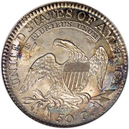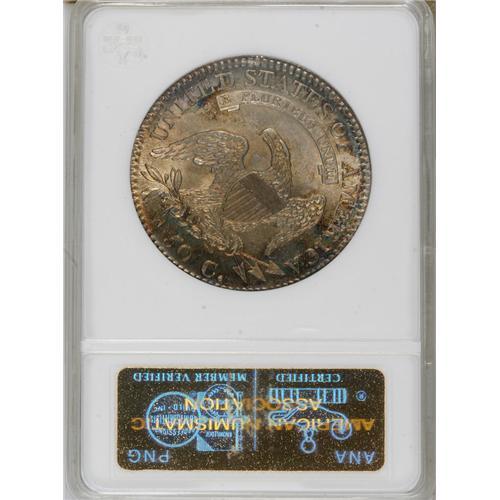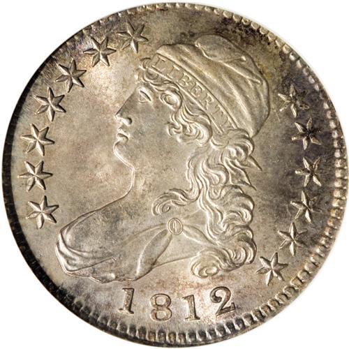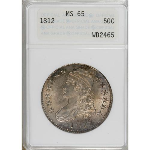 <B>1812 50C MS65 ANACS.</B></I> O-107, R.1. All digits of the date lean left, the 1 is high, and the 81 is closer than 18 or 12, and there is a small tine off the right corner of the shield. Delicate golden-gray toning, accented with cobalt-blue and lavender on the reverse, adorns lustrous surfaces. Sharply struck, and devoid of significant contact marks. A really sharp Bust half dollar! Housed in an ANA cache holder.<BR><BR><b>Shipping:</b> Coins & Currency (<a target="_blank" href="http://www.heritageauctions.com/common/shipping.php">view shipping information</a>)