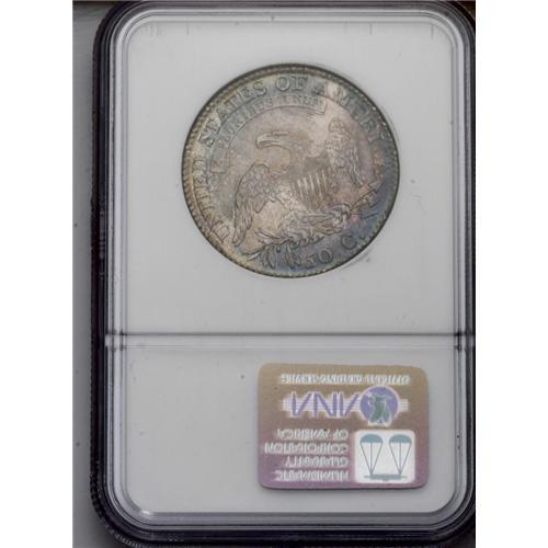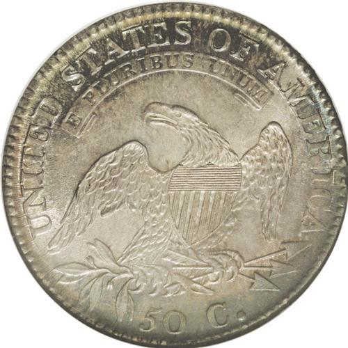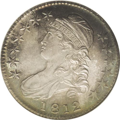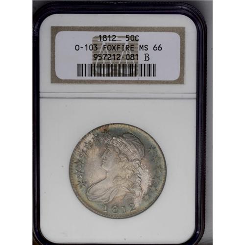 <B>1812<50C> MS66 NGC.</B></I> Ex: Foxfire. O-103, R.1. Forest-green, lemon-gold, and gunmetal-lilac toning graces the obverse. The reverse patina is equally impressive, and features plum, aquamarine, and peach swaths. Cartwheel luster dominates both sides, and the fields are unusually smooth. Faint marks near the cheekbone and on the neck are only detected under a strong glass. Well struck on the major devices and left borders, while the right side stars are soft, as made from slightly misaligned dies. The O-103 variety is readily attributed by a series of parallel vertical die lines beneath the eagle's beak. This example has a faint die crack from the U in UNITED through 50 C. This relatively lengthy die crack was known to Overton, and he states it is present on some but not all pieces, yet he failed to designate an "a" die state for those with the crack.