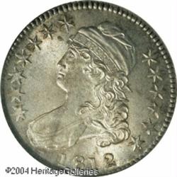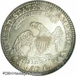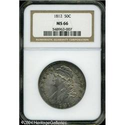 1812 50C MS66 NGC. O-110, R.1. A pair of crossbars <B>1812 50C MS66 NGC.</B></I> O-110, R.1. A pair of crossbars extend far into the right (facing) wing and attribute the Overton variety. Golden-brown and apple-green color dominates the borders and frames the creamy gunmetal-gray centers. Potent cartwheel luster rolls unencumbered across the inordinately undisturbed surfaces. The major devices are needle-sharp, although a few stars do not possess complete centril definition. Among the finest known examples of the die pairing. Population: 24 in 66, none finer (10/04). <BR><BR><B>Important notice:</B> Heritage usually auctions material at the rate of 200-250 lots per hour. On some occasions eBay Live bid software or the Internet may not be able to keep up with the pace of the auction. We recommend placing a realistic absentee bid now as insurance to avoid disappointment. Occasionally the auctioneer may eliminate or reject an eBay Live bid, and the auctioneer may also reopen a lot after the close of the eBay live bidding (usually because we missed an audience bid), and may reject your bid even if it shows you as the winning bidder. By bidding via eBay Live, you agree that Heritage may award the lot to another bidder at its sole discretion under the circumstances described above or any other reasonable circumstances. Since eBay bids are not shown to us until we open the lot on the floor, we treat those bids just like floor bids. In most cases the floor responds before the eBay bid is presented to us, due to Internet lag time, so for consistency we have made it a policy that floor bids are always considered first over tie eBay live bids. Also please note that all Heritage lots purchased through eBay Live carry a 20% Buyer's Premium. Please make sure you read the Terms and Conditions before you bid. This lot is being auctioned in conjunction with a live floor auction by Heritage Galleries & Auctioneers. All final auction and invoice information will be supplied by Heritage Galleries & Auctioneers, and all other information should be considered preliminary. Lot:6050