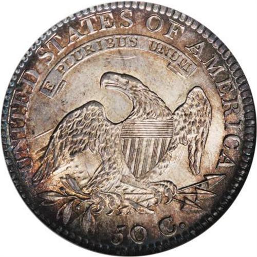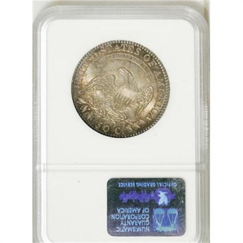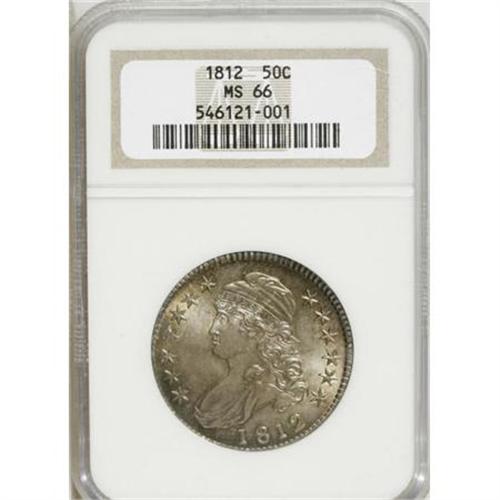 <B>1812 50C MS66 NGC.</B></I> O-109a, R.2. The serif and curl of the 2 have square ends, and the inner point of star 10 shows a low, rounded bump in the field nearby. The reverse on this late die state shows numerous ridges, bumps, and lumps under and above the eagle's left (facing) wing, all of which are uncommonly bold on this example. The lustrous surfaces are beautifully preserved. Translucent cerise-gray patina is noted on the obverse, while the reverse offers golden shadings. The strike is crisp and bold, and even under a loupe, any flaws are difficult to spot. An attractive exemplar that would make an excellent addition to the dedicated numismatic cabinet. For non-overdate 1812 varieties, Census: 20 in 66, 0 finer (11/07).<BR><BR><B>Coin Engraver:</B> John Reich<BR><BR><b>Shipping:</b> Coins & Currency (<a target="_blank" href="http://www.heritageauctions.com/common/shipping.php">view shipping information</a>)