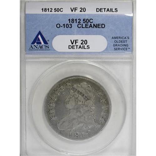 <B>1812 50C --Cleaned--ANACS. VF20 Details.</B></I> O-103. NGC Census: (2/573). PCGS Population (10/536). Mintage: 1,628,059. Numismedia Wsl. Price for NGC/PCGS coin in VF20: $110. (#6100)<BR><BR><B>Coin Engraver:</B> John Reich<BR><BR><b>Shipping:</b> Coins & Currency (<a target="_blank" href="http://www.heritageauctions.com/common/shipping.php">view shipping information</a>)