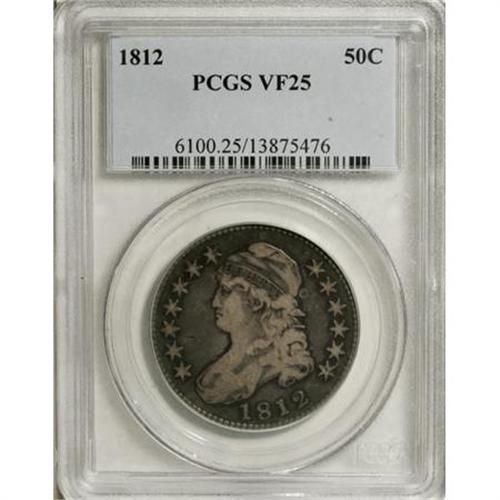 <B>1812 50C VF25 PCGS.</B></I> PCGS Population (25/536). NGC Census: (4/589). Mintage: 1,628,059. Numismedia Wsl. Price for NGC/PCGS coin in VF25: $130. (#6100)<BR><BR><B>Coin Engraver:</B> John Reich<BR><BR><b>Shipping:</b> Coins & Currency (<a target="_blank" href="http://www.heritageauctions.com/common/shipping.php">view shipping information</a>)