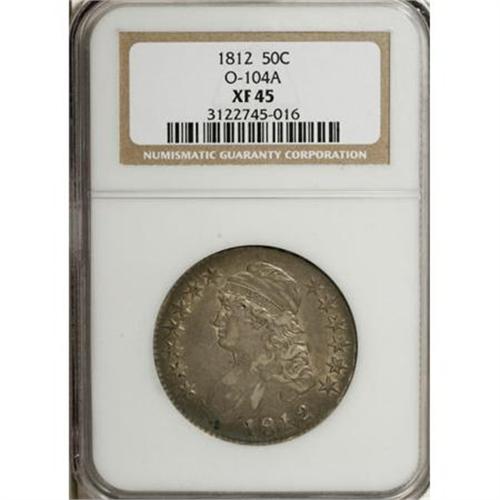 <B>1812 50C XF45 NGC.</B></I> O-104A. NGC Census: (50/481). PCGS Population (57/380). Mintage: 1,628,059. Numismedia Wsl. Price for NGC/PCGS coin in XF45: $272. (#6100)<BR><BR><B>Coin Engraver:</B> John Reich<BR><BR><b>Shipping:</b> Coins & Currency (<a target="_blank" href="http://www.heritageauctions.com/common/shipping.php">view shipping information</a>)