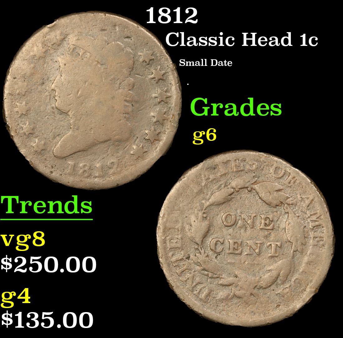 1812 Small Date . Classic Head Large Cent 1c Grades g+.