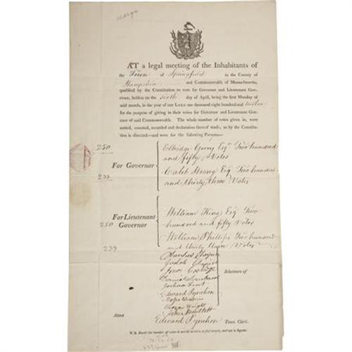 <B>1812 Springfield, Massachusetts Election Certification Document for Governor and Lieutenant Governor</B></I>. One page, partially printed, 7.5” x 12.5”, Springfield, April 6, 1812, signed by nine Selectmen of Springfield and sent to Benjamin Homans, Secretary of the Commonwealth, Boson, toned, with remnants of wax seal, with fold creases, else very good. This document certified that Elbridge Gerry received 250 votes, beating out his opponent Caleb Strong who only received 233 votes. Strong ultimately won but Gerry became the 5th Vice President of the United States, serving under James Madison. <I>Ex. Henry E. Luhrs Collection</B></I>.<BR><BR><BR><BR><b>Shipping:</b> Flat Material, Small (<a target="_blank" href="http://www.heritageauctions.com/common/shipping.php">view shipping information</a>)