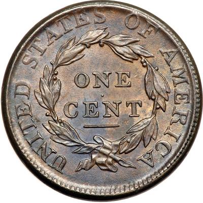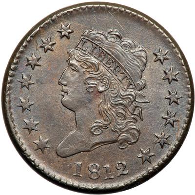 1812 S-288 R2 Large Date. AU-50. Turban Head. Sharpness very close to mint state but there are a few short pinscratches at stars 6 & 7 and above the head, plus another up from the E in LIBERTY to the top of the head. None of these marks is especially distracting, but there are too many to ignore. Attractive frosty steel brown with a splash of darker steel brown toning at CE in CENT and light bluish steel overtones in protected areas. The surfaces are satiny and the eye appeal is excellent in spite of the minor marks. M-LDS, Breen state III. The dentils are clearly fused at stars 1-3 and at star 6. The obverse is properly centered on the planchet but the reverse is off a bit to K-11. Called MS60 net EF45 and tied for CC#12 in the Noyes census, his photo #22010. DWH #3110.