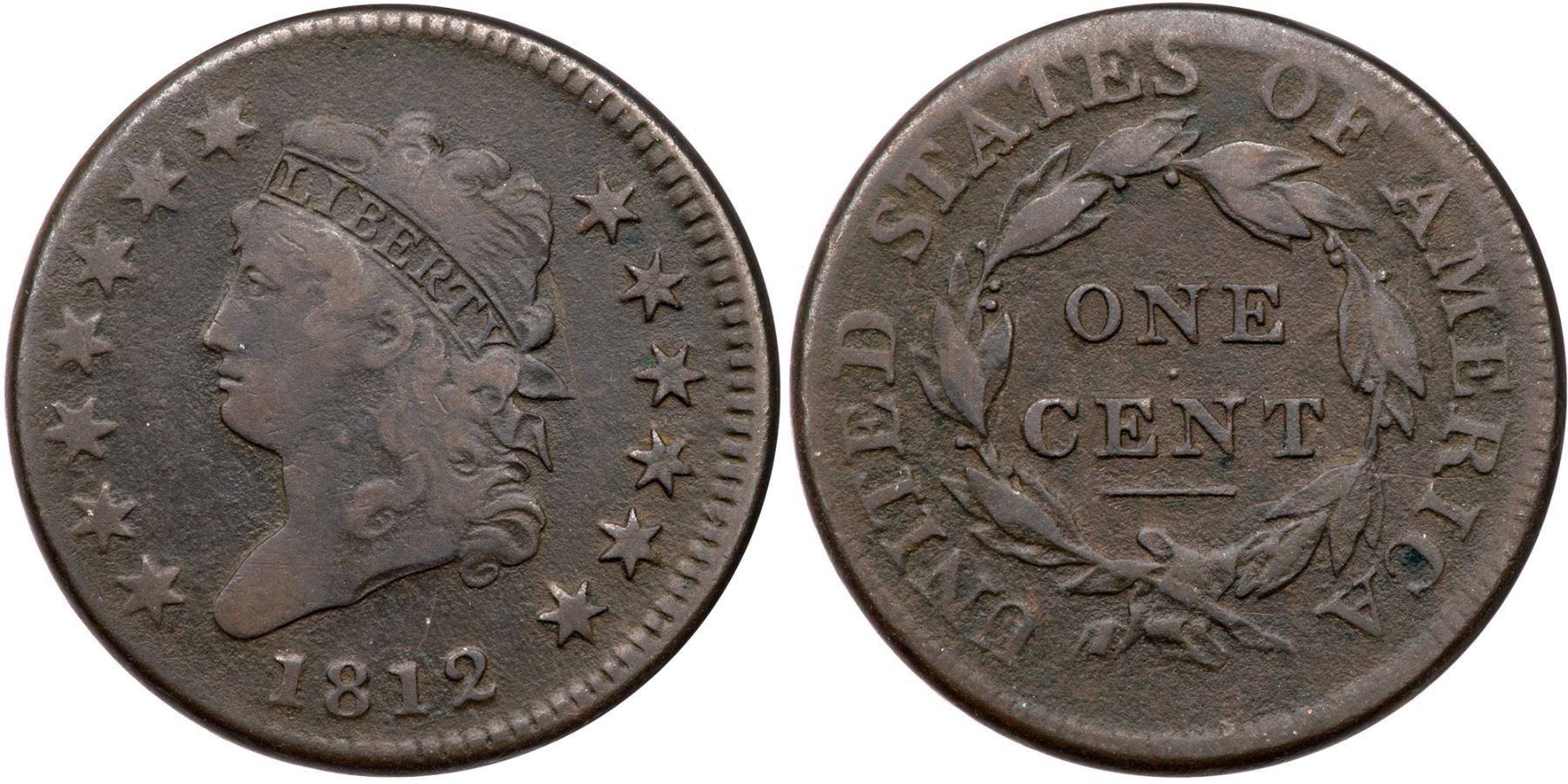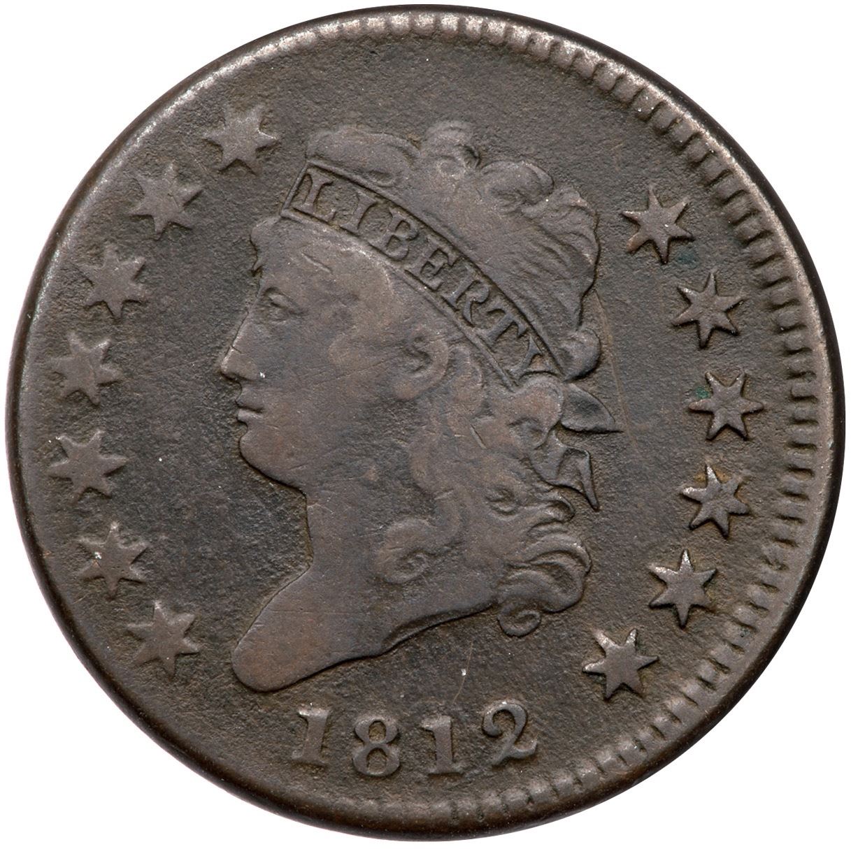 1812 S-290 R-1 VG7A few points sharper but there is light granularity in the fields and protected areas. Toned mostly dark olive brown with lighter medium brown on some high points. Bold date and legends.Ex; Tim Paquette