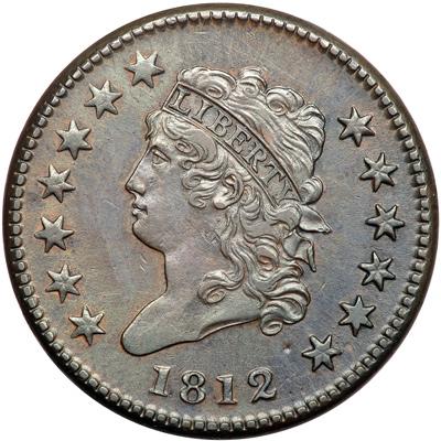 1812 S-290 R1 Small Date. VF-35. Turban Head. Sharpness EF45 but covered with myriad microscopic hairlines and there is a tiny pitmark left of star 13. Otherwise the surfaces are smooth and free of defects. Frosty bluish steel brown and chocolate with traces of frosty light brown toning in protected areas of the obverse. Sharply struck E-MDS, Breen state II. The dentils are still crisp but there are die clashmarks inside the wreath. The obverse is nicely centered on the planchet while the reverse is off a bit to K-1. DWH #3111.