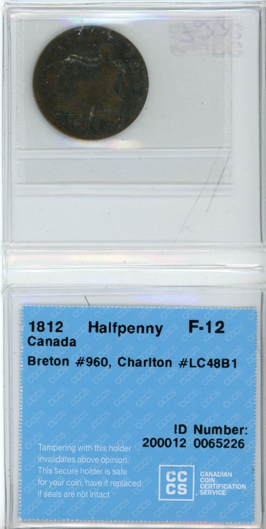1812 Tiffin Pre-Confederation Token. Breton 960. Charlton LC-48B1. CCCS graded F-12.