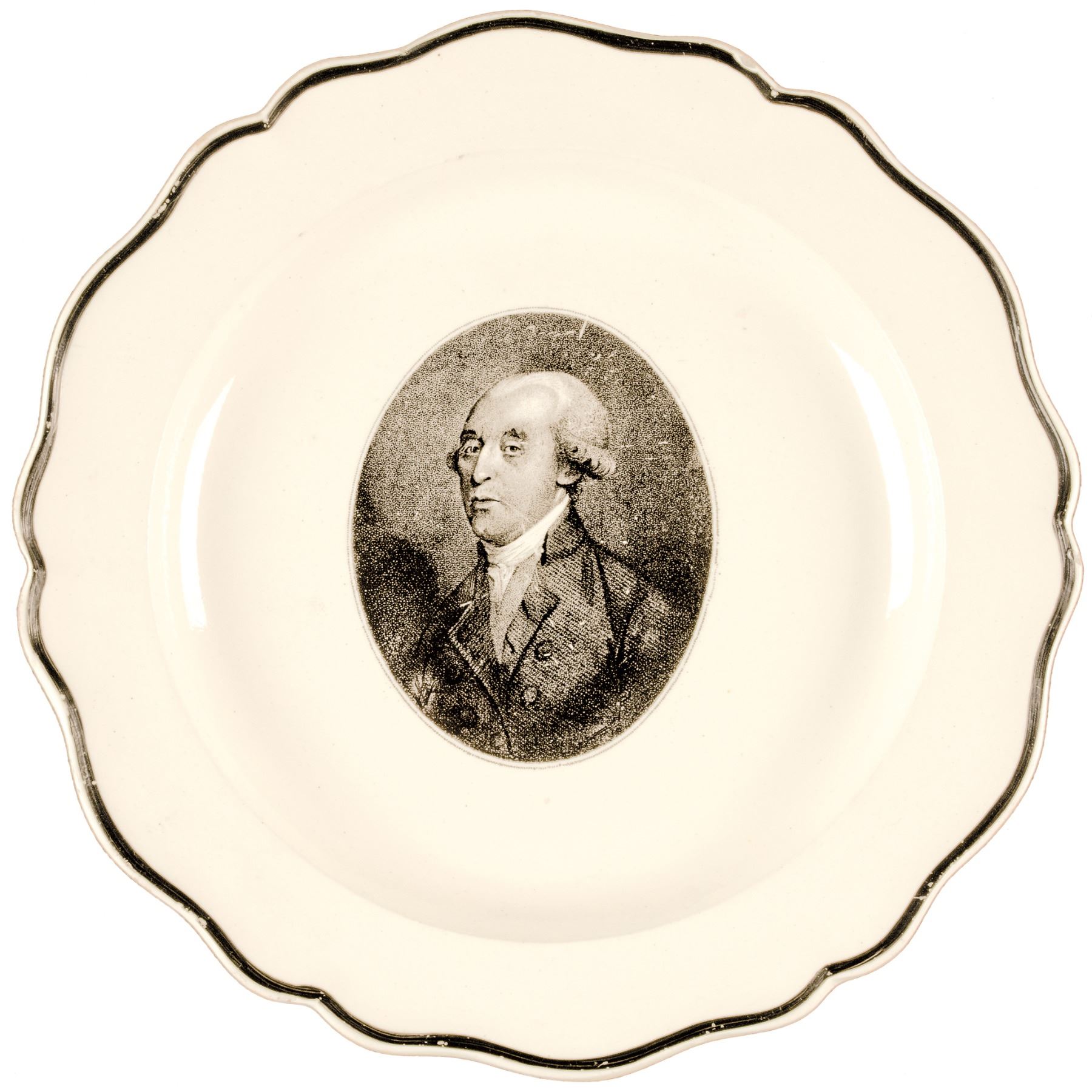 This impressive Plate is similar to other Transferware pieces produced for Madison's predecessor, Thomas Jefferson. Madison Portrait Plate pieces are exceedingly rare. The black transfer is much as originally made and there is a Hand-painted outer black highlight to the rim, with just one small chip on the rim edge at 1:00. This one was likely only used for display purposes since first sold, as it is a particularly pleasing, bold and highly distinctive form for display.