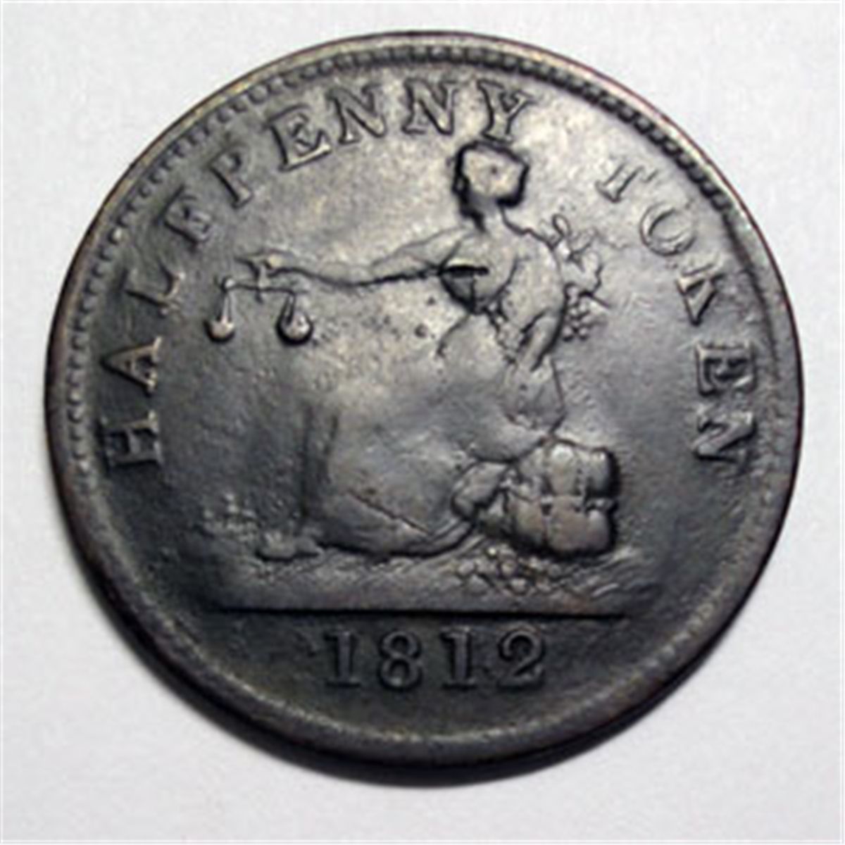 merchant named Joseph Tiffin. They were made in 1832 but predated to 1812 to avoid anti-importation regulations. The design is based on that of a British token. This half penny is very scarce.