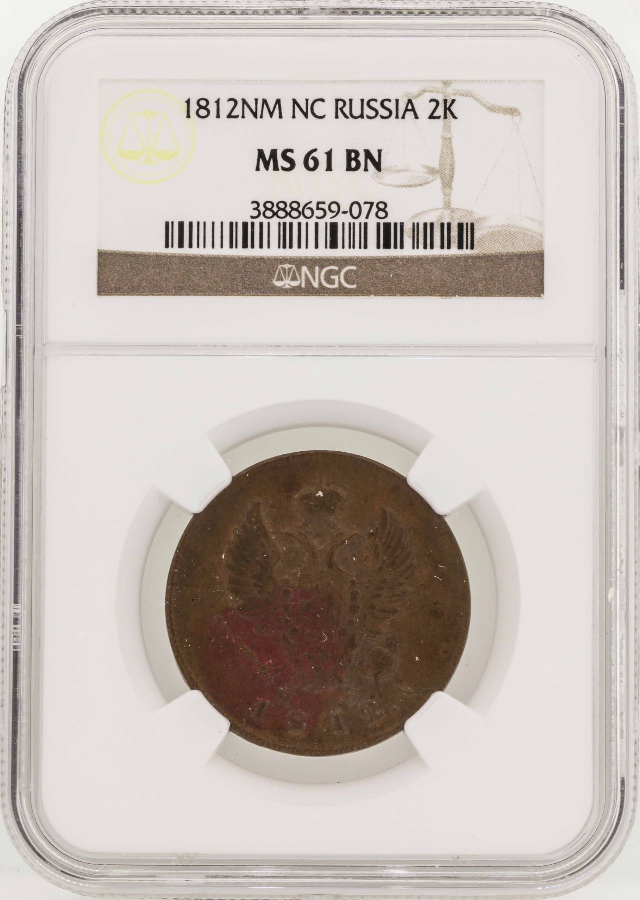 One 1812NM Russia 2 Kopeks Copper Coin NGC MS61BN.