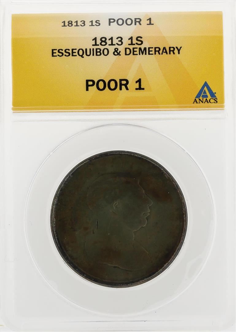 One 1813 1 Stiver Essequibo and Demerary Coin ANACS Poor 1. ANACS Certified.
