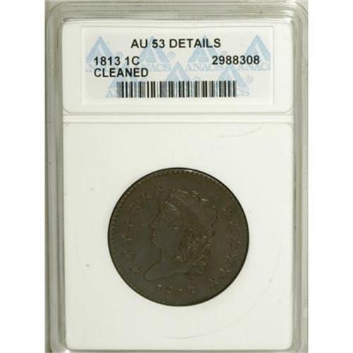 <B>1813 1C --Cleaned--ANACS. AU53 Details.</B></I> S-292, B-2, R.2. A smooth mahogany-brown cent with glimpses of golden-brown luster in selected areas. The stars have soft centers, partly due to die wear, but the major devices are bold. Mildly and inoffensively cleaned. EAC 25.<BR><BR><b>Shipping:</b> Coins & Currency (<a target="_blank" href="http://www.heritageauctions.com/common/shipping.php">view shipping information</a>)
