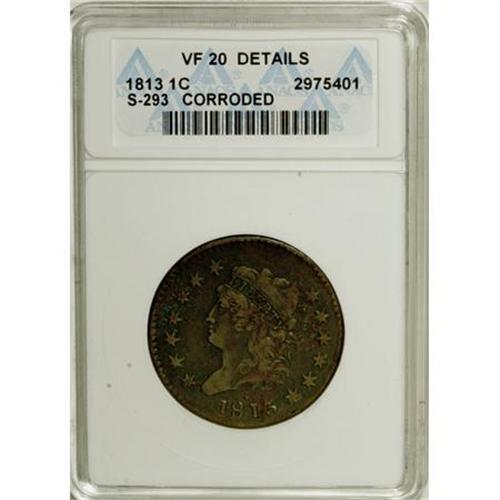 <B>1813 1C --Corroded--ANACS. VF20 Details.</B></I> S-293. NGC Census: (4/81). PCGS Population (14/104). Mintage: 418,000. Numismedia Wsl. Price for NGC/PCGS coin in VF20: $433. (#1570)<BR><BR><b>Shipping:</b> Coins & Currency (<a target="_blank" href="http://www.heritageauctions.com/common/shipping.php">view shipping information</a>)