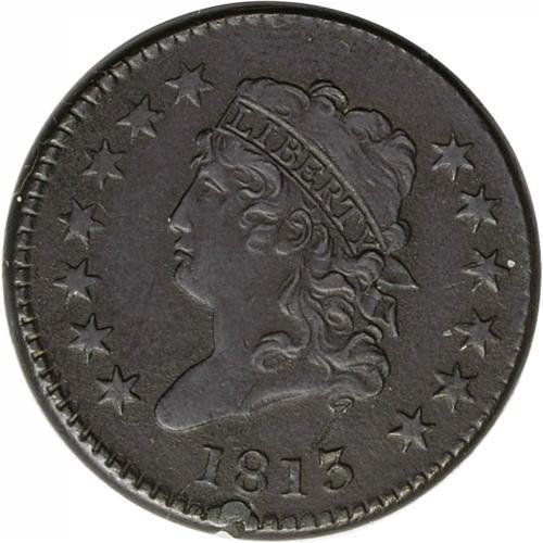<B>1813<1C> S-292, B-2, Low R.2--Corroded, Damaged--NCS. AU Details. Fine 15 EAC.</B></I> Finely granular steel-brown surfaces with some greenish patina on the reverse. A heavy rim nick below the date and old obverse and reverse scratches reduce the overall grade of this example.