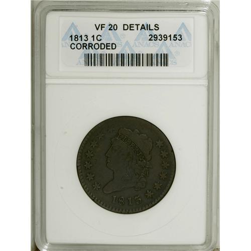 <B>1813 1C --Corroded--ANACS. VF20 Details.</B></I> NGC Census: (19/104). PCGS Population (14/104). Mintage: 418,000. Numismedia Wsl. Price: $433. (#1570)<BR><BR><b>Shipping:</b> Coins & Currency (<a target="_blank" href="http://www.heritageauctions.com/common/shipping.php">view shipping information</a>)