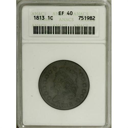 <B>1813 1C XF40 ANACS.</B></I> S-292, B-2, R.2. A likeable medium brown piece, smooth aside from small raised speckles in selected areas. Struck from late-in-life dies with an orange-peel texture (as made) on the obverse field. The Classic type is notoriously elusive in quality circulated grades. EAC 25.<BR><I>From The Casa Becca del Norté Collection.</B></I><BR><BR><B>Coin Engraver:</B> John Reich<BR><BR><b>Shipping:</b> Coins & Currency (<a target="_blank" href="http://www.heritageauctions.com/common/shipping.php">view shipping information</a>)