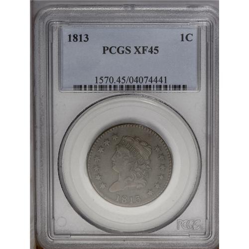 <B>1813 1C XF45 PCGS.</B></I> S-292, Low R.2. Medium olive and lighter brown surfaces with only a few grade-consistent abrasions. A desirable example that is from a late die state with flowlined surfaces. This is one of the scarcer dates in the Classic Head series. The rule for large cents of this design is that dates ending in an even number (1808, 1810, 1812, and 1814) are common, and the odd-numbered dates are scarce. EAC 30.