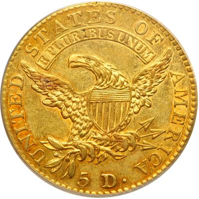 1813 $5 Capped Head. . BD-2. PCGS graded AU-53. Popular first year of the Capped Head to Left Large Diameter type. Well struck with plenty of luster still present, all enhanced by touches of natural golden-orange toning. In spite of a fairly high mintage (most were melted, of course), there are only two die varieties recorded for 1813. A single obverse was paired with one of two reverses. BD-2 is characterized by having the E of the motto more or less centered below the first S in STATES.
