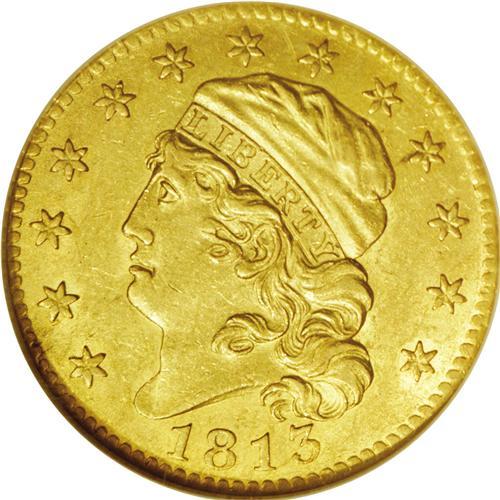 <B>1813<$5> MS61 NGC.</B></I> B. 1-A, Miller-119, R.3. Distinguished from Miller-120 by the location of the first S in STATES relative to the E in scroll below. This yellow-gold Mint State specimen exhibits tinges of light green, and shows considerable luster in the recessed areas. The design elements are well struck, and nicely centered on the planchet. The dentilation is strong on both sides, and there are no noticeable adjustment marks. Minor handling marks are visible over each side.