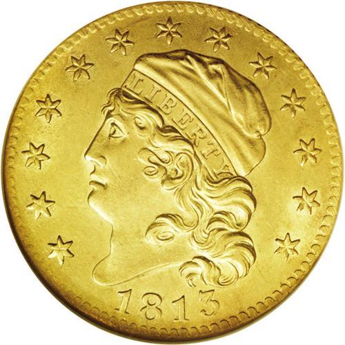 <B>1813<$5> MS61 NGC.</B></I> B. 1-A, Miller-119, R.3. Premier year of the Capped Head half eagle series, and by far the most available issue of the modified design, the 1813 enjoys widespread popularity as a type coin. The obverse of this well struck example is the brighter of the two sides and exhibits a pair of short, paper-thin blemishes on Liberty's cheek that could easily be interpreted as adjustment marks. A uniform reddish patina covers the more satiny reverse.