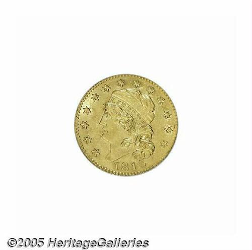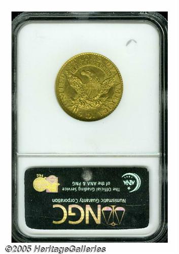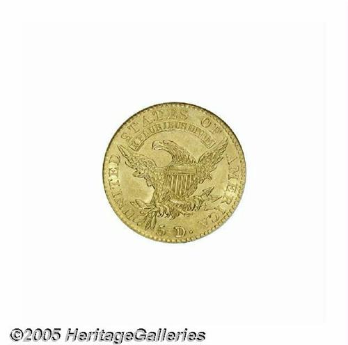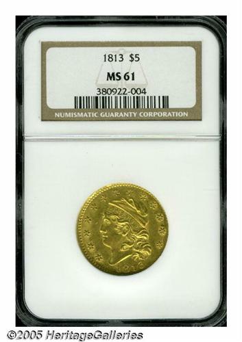 <B>1813<$5> MS61 NGC.</B></I> B. 1-B, Miller-120, R.6. Lightly marked for the MS61 level, this attractive Half Eagle features straw-gold color and has ample bright luster. The strike is very sharp, since only the claws and the forehead curls lack intricate definition. The first issue of the Capped Head Left design, which continues the reverse of John Reich's 1807 design but modifies Liberty's portrait. The most obvious change is that the bust is truncated just beneath the neck on the 1813 version. Although the 1813 Miller-119 is common by the standards of the type, Miller-120 is several times scarcer and is rarely encountered.