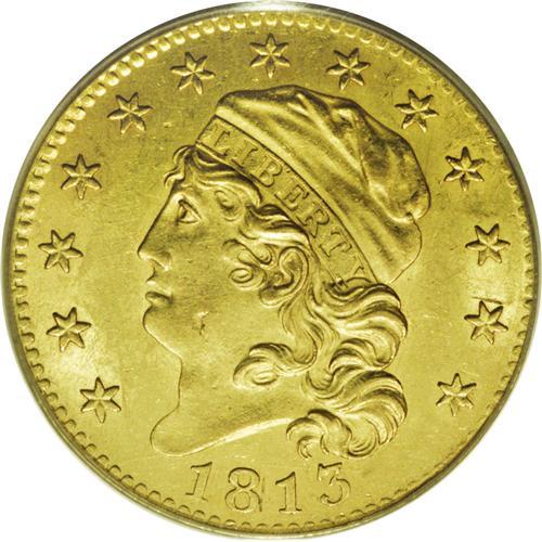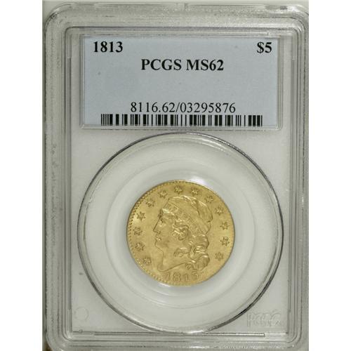 <B>1813 $5 MS62 PCGS.</B></I> Breen-6467, BD-2, R.4. This is the first year of issue for the modified Capped Head design by John Reich, adapted from his earlier Capped Bust design. This design was actually used through mid-1834, although two types are usually differentiated, having either a large or small diameter with 1829 representing the transitional year. During the span of 22 years, only 1813, 1818, and 1820 are seen with any regularity. The 1814/3 overdate and 1823 issues are also occasionally encountered, but all other dates are considered moderate to major rarities. This frosty and lustrous green-gold example has sharp design features and the surfaces are minimally abraded, consistent with the grade.<BR><BR><b>Shipping:</b> Coin/Currency (<a target="_blank" href="http://www.heritageauctions.com/common/shipping.php">view shipping information</a>)