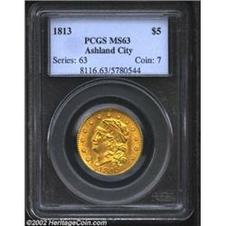 1813 $5 MS63 PCGS. B. 1-A, Miller-119, R.3. Among Robert Scot's Capped Head Left design, the 1813 is the most frequently encountered date. High grade examples are occasionally available and are the only date in the series that can be found with any regularity in Mint State for this very rare type. This piece is uncommonly well struck with complete definition on Liberty's hair, the peripheral stars, and even the eagle's plumage (not usually an area found fully struck on this date). A few light abrasions account for the grade. The mint luster is softly frosted and the surfaces have an unusual fine-grain granularity.From the Ashland City Collection. Important notice: We expect to be auctioning lots at the rate of 200-250 per hour. Sometimes eBay Premier live bid software cannot keep up with that pace, so we strongly recommend that you place a realistic proxy bid now as insurance to avoid disappointment. Also please note that all Heritage/CAA lots purchased through eBay Premier carry a 20% Buyer's Premium. Please make sure you read the Terms and Conditions.