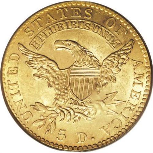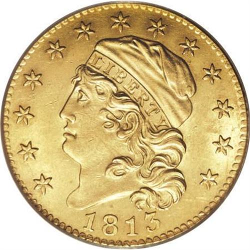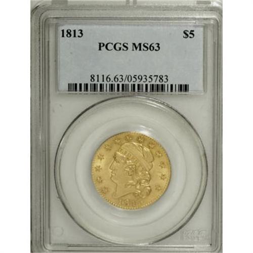 <B>1813 $5 MS63 PCGS.</B></I> Breen-6467, BD-1, R.2. Frosty green-gold luster really brings out the sharp design details of this Select Mint State half eagle. The first year of the modified design issued until 1834, the Capped Head design is similar to the previous Capped Bust design, but lacks the draped bosom of the earlier issue. John Reich engraved both designs during his ten-year tenure at the U.S. Mint. Aside from minor clash marks visible within the letters of LIBERTY and in the spaces between the vertical shield stripes on the reverse, both dies are perfect without die cracks or lapping.<BR><BR><B>Coin Engraver:</B> John Reich<BR><BR><b>Shipping:</b> Coins & Currency (<a target="_blank" href="http://www.heritageauctions.com/common/shipping.php">view shipping information</a>\)