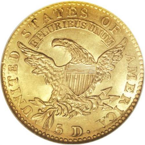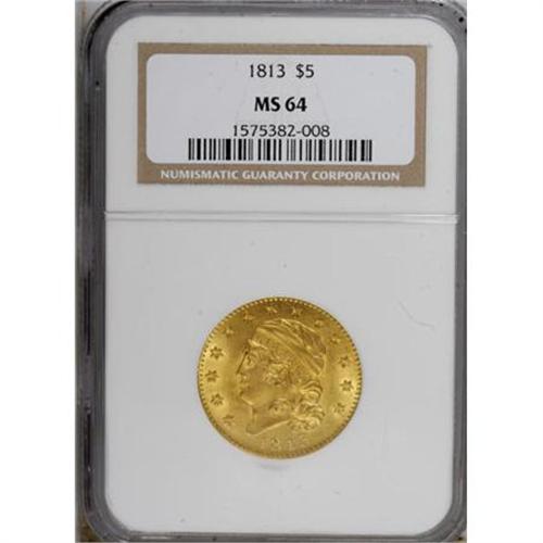 <B>1813 $5 MS64 NGC.</B></I> BD-1, R.2. The first S in STATES is over the right side of the E in the motto. The 1813 half eagle is the first year of a new type and, like most-first-year issues, it appears to have been saved for posterity by collectors and noncollectors alike. In <I>Guide Book </B></I>terminology, this is the Capped Head to Left, Large Diameter, Bold Relief type (or subtype, since the Bold Relief subtype only lasted through 1815).<BR> Although this type showed considerably increased mintages from the previous Capped Bust to Left half eagles of 1807-1812, the Capped Head to Left half eagles were also much more hoarded and melted than the previous type, as John Dannreuther points out in his indispensable <I>Early U.S. Gold Coin Varieties.</B></I> Most survivors of the later type are in the higher circulated grades or Uncirculated, whereas the earlier coins often show considerable wear. Dannreuther says, "Because there were relatively few gold coins in circulation stateside from 1812 onward, and none were seen after 1821 until the introduction of the lighter gold coins after July 21, 1834, this is expected. As mentioned, this type is many times rarer than those coins of 1812 and prior. Those coins of 1813 are the only available date of this type, those of 1814 through 1820 are scarce to ultra rare, while those of 1821 through 1829 are almost all rare or exceedingly rare. Those coins used in international commerce for goods and services were mostly melted. Only those few coins hoarded domestically and not melted after the weight change in 1834 are the examples we have to collect today, plus the few coins plucked from foreign sources."<BR> We accordingly have an interesting situation in the present 1813 half eagle, as a high-grade (near-Gem) example one of the most available issues in one of the most difficult and elusive of all U.S. coin series; in other words, the quintessential type coin. The BD-1 is also the only readily available <I>variety</B></I> for the type. This coin offers brilliant luster emanating from the greenish-gold surfaces, which are remarkably attractive and distraction-free. A couple of minuscule ticks appear in the lower right obverse field, and both sides show some old clash marks, but the overall appearance is strictly in concordance with the near-Gem grade. This coin is almost certainly destined to fill some long-empty hole in a high-grade 19th century type set.<BR><BR><BR><B>Coin Engraver:</B> John Reich<BR><BR><b>Shipping:</b> Coins & Currency (<a target="_blank" href="http://www.heritageauctions.com/common/shipping.php">view shipping information</a>)