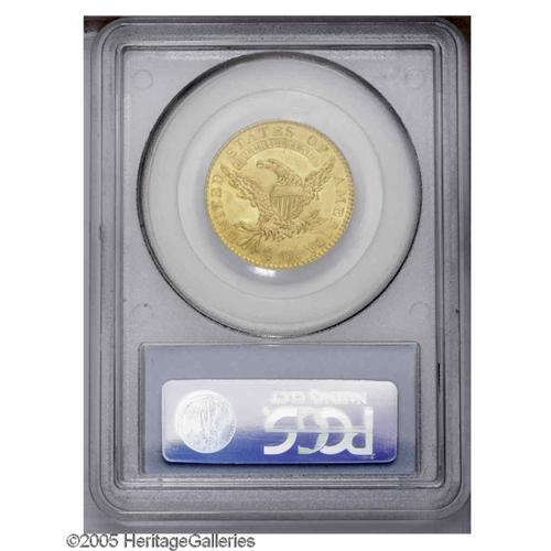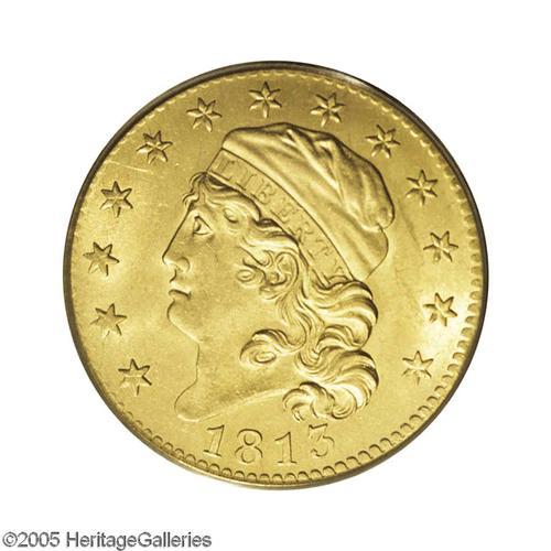 <B>1813<$5> MS64 PCGS.</B></I> B. 1-A, Miller-119, R.3. Because of widespread meltings of American gold coins from the late 1790s through 1834, the Capped Head Left series of half eagles (which spanned much of that period) is arguably the most difficult series in all of U.S. numismatics to assemble on a date-by-date basis. The 1813 is the first year of this new design, and it was apparently set aside as such because it is clearly the most available date in the series, and is the usual choice for type purposes. Offered here is a particularly well preserved example, with frosty green-gold surfaces that are equally sharp from side to side. Only the presence of a few wispy field marks keeps this splendid 1813 half eagle from an even loftier rating. Just three pieces have been graded finer, by PCGS (11/05).