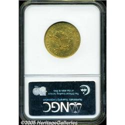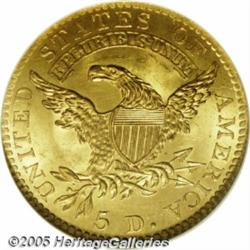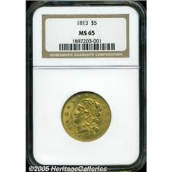 <B>1813 $5 MS65 NGC.</B></I> B. 1-A, Miller-119, R.3. The 1813 Half Eagle is important to collectors for two reasons. First, it is the initial year issue in the Capped Head Left series as modified by Robert Scot after John Reich's original concept. Second, it is by far the most affordable and obtainable date in the series, a series which few would dispute is the most difficult in all of U.S. numismatics. While the 1813 is relatively obtainable in circulated condition and lower Uncirculated grades, it is very elusive in the higher grades of Mint State. This is one of only four pieces to have been so graded with none finer at NGC, PCGS has seen two MS65s with one finer (2/05).<BR> The striking details on this piece are uncommonly well defined on each side showing full definition on most of the stars, Liberty's hair, and the feathers on the eagle's neck. The rich green-gold mint luster is free from any major blemishes, with only a small mark or luster graze seen here and there. One lateral abrasion is visible on Liberty's nose, and a couple of small pinscratches are on the reverse from the right (facing) wingtip to the first A of AMERICA. No adjustment marks are reported on either side. Exceptional quality and one of the finest currently available.