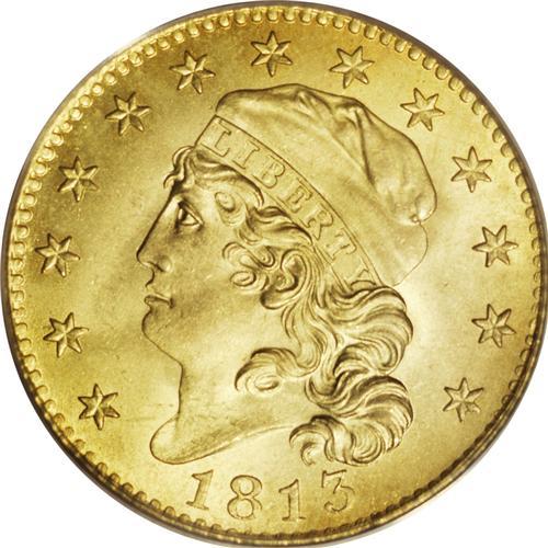 <B>1813 $5 MS66 PCGS.</B></I> BD-2, R.4. In 1813 the half eagle was the only U.S. gold denomination being produced. Gold eagles had not been made since 1804 (they were resumed in 1838), and quarter eagle production was interrupted from 1808 until 1821. The Capped Head half eagles, produced from 1813 to 1834, were made during a period when widespread melting took place. Most of the coins never circulated, and they frequently went straight from the Mint into the hands of bullion dealers. Some forty thousand pieces of "recent mintage" were destroyed in a single Paris melt in 1831, according to Walter Breen.<BR> The reason for this mass melting of U.S. gold coinage was simple: the Coinage Act of 1792 had established a 15:1 ratio between silver and gold, but by 1813 the ratio in Europe was 16:1 or more. All circulating U.S. gold coins were now worth more than their face value in silver, as bullion dealers swiftly realized. Fifteen ounces of silver would buy one ounce of gold in the United States, but that same ounce of gold would bring sixteen ounces of silver in Paris or London.<BR> The 1813 half eagle is important to collectors for several reasons: First, it is the initial year in the Capped Head series. Second, it is by far the most affordable and obtainable date in the series, a series which few would dispute is the most difficult in all of U.S. numismatics. Of the seventeen major issues (excluding varieties) in this series, only the 1813, 1814/3, 1818, 1820, 1823, and 1826 are offered for sale with any degree of regularity. This means that the "average" Capped Head half eagle issue is a rarity. According to Jeff Garrett and Ron Guth, writing in <I>The Encyclopedia of U.S. Gold Coins 1795-1933</B></I> (2006): "The Capped Head to Left, Large Diameter type, issued from 1813 to 1829, contains some of the greatest rarities in American numismatics--coins such as the 1815 half eagle, the 1822 (three known), the 1825/4 (two known), and the 1829 Large Date. Most of the dates in this series have low mintages, usually below 50,000 coins. The 1820 half eagle has the highest mintage (263,806 coins), and the 1815 has the lowest (635 coins). Some dates, such as the 1819, have a reasonably high mintage (51,723 coins) but remain extremely rare today."<BR> Approximately 600 examples of the 1813 half eagle have been encapsulated through the combined efforts of NGC and PCGS; but that figure probably reflects numerous resubmissions over the past twenty years. It is possible, however, that as many as 500 pieces still exist, and perhaps a few more. Many of the known examples have survived in Mint State, including quite a few near-Gems. However, the population drops off dramatically at the Gem level, and any 1813 half eagle in MS65 or better condition is an extreme rarity.<BR> Two varieties of the 1813 half eagle are known, and these are identified as Bass Dannreuther-1 (BD-1) and Bass Dannreuther-2 (BD-2). BD-1 is also sometimes known as Miller-119, based on the reference by Robert W. Miller, Sr.; and has the D in the denomination leaning sharply to the left. A second variety, BD-2, has both the 5 and the D in the denomination upright, with the left serifs of D showing evidence of recutting. The BD-1 variety is about twice as common as the BD-2. As both varieties are from the same obverse die, determination of the emission sequence is as simple as comparing die states of the obverse on each of the two varieties. No die cracks have been observed on the BD-1 variety. A thin die crack from the border left of the date to the bust is seen on this example of BD-2, as on a couple of the other known specimens. The appearance of this die crack clearly tells us that the BD-2 variety was struck second.<BR> This Premium Gem is possibly the finest-known example of the date, and almost certainly of the variety. It is sharply struck with all details on both sides exceptionally well detailed. Although the centering is not perfect, the borders on both sides are complete. All of the hair curls on the obverse are well defined, and each of the stars has complete center lines. The reverse detail is similarly sharp, with the sole exception of the eagle's claws which are a bit bluntly defined. The surfaces are frosty and fully lustrous with lovely yellow-gold color. Light orange toning is visible on the reverse, and near the obverse periphery, and adds to the overall aesthetic appeal of the piece.<BR> This was the first year of issue for the Capped Head design type, modified from the Draped Bust type introduced by John Reich in 1807. According to Walter Breen, writing in 1966: "Obverse shows head of Liberty, without drapery, on a much larger scale than previous profiles. The cap is much more close-fitting. Curls somewhat resemble those on the 1807-12 design but are not identical. Rounded truncation of the bust shows. This head continued to be used until 1829, in which year modifications of design appeared in the new hub introduced by William Kneass. Stars are no longer divided 7+6 but rather form a continuous line around and above head. Dates are larger than on previous years except for 1810 and 1812. The eagle is also different in minor details, most noticeably at wing feathers nearest his body; shield is smaller, arrows much wider and more spread apart, motto letters taller, claws much larger and the individual ones more spread apart, leaves longer and wider, etc. Border denticulation on both sides is much more coarse than formerly."<BR> From the famous Garrett Collection that was originally formed by T. Harrison Garrett in the latter 19th century and bequeathed to his son, Robert. As Robert Garrett was more of an art aficionado, and his brother John Work Garrett was more the numismatist, the two traded collections. After John Work Garrett passed away, his widow willed the collection to the Johns Hopkins University in Baltimore. Eventually the collection was sold in a series of auctions, the first in 1976 and the others from 1979 